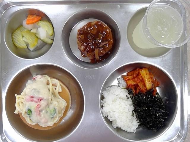 * 석식: (자)쌀밥+김자반+볶음김치, 빠네크림파스타, 함박스테이크, 4색모듬피클, 수제레몬에이드