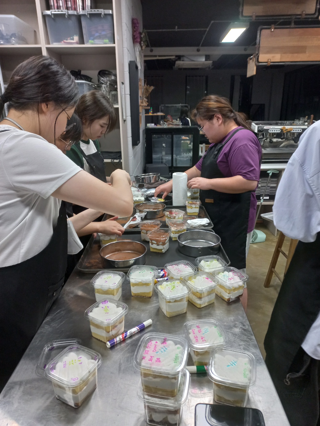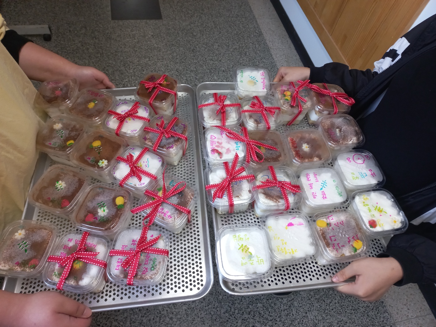 1. 학생들끼리 조각 티라미수와 조각 생크림 케익을 만들고 있는 활동입니다.
