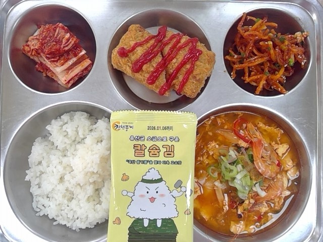 * 석식: 흰밥, 순두부찌개, 치즈롤까스, 일미고추장무침, 칼슘김, 배추김치