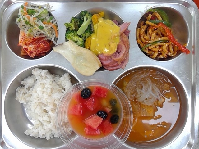 * 중식: 보리혼식, 돼지갈비 김치찌개(당면), 훈제오리단호박오븐구이, 어묵채볶음, 숙주나물, 배추김치, 수박화채