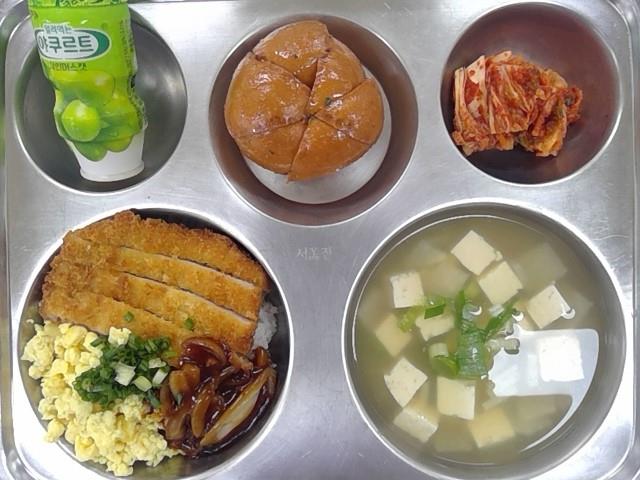 저녁:돈까스일식덮밥,두부새우젓국,배추김치,얼려먹는 샤인머스켓주스,육쪽마늘빵