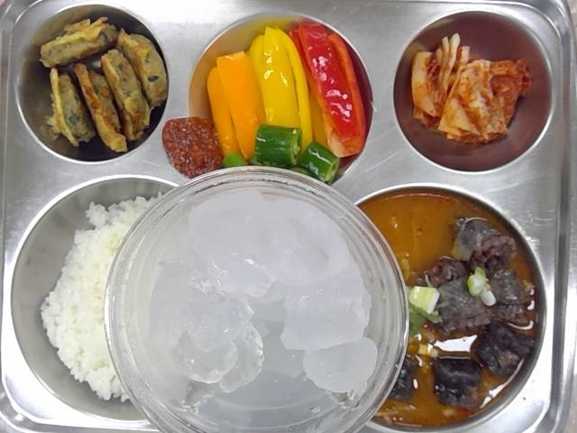 저녁:쌀밥,순대국,채소가득완자전,배추김치,블루레몬에이드(얼음컵),삼색파프리카/쌈장(자)