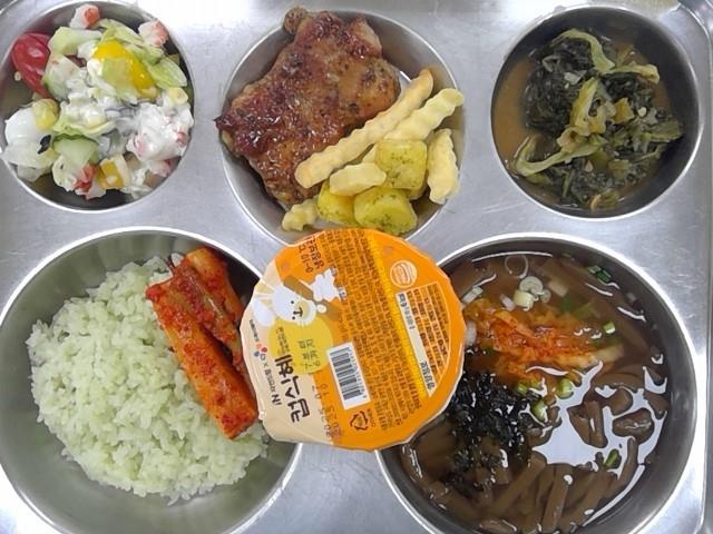 점심:클로렐라밥,도토리묵채국,우거지된장,콥샐러드,치킨스테이크+맛감자튀김,알타리김치,식혜
