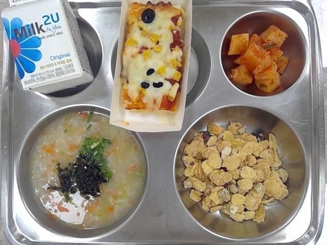 아침:대게살야채죽,깍두기,강화우유,소떡위에 피자,시리얼(아몬드그래놀라)