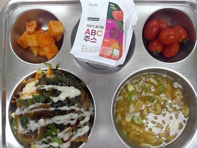 아침:떡갈비마요덮밥,유부된장국,깍두기,대추방울토마토,에이비씨주스