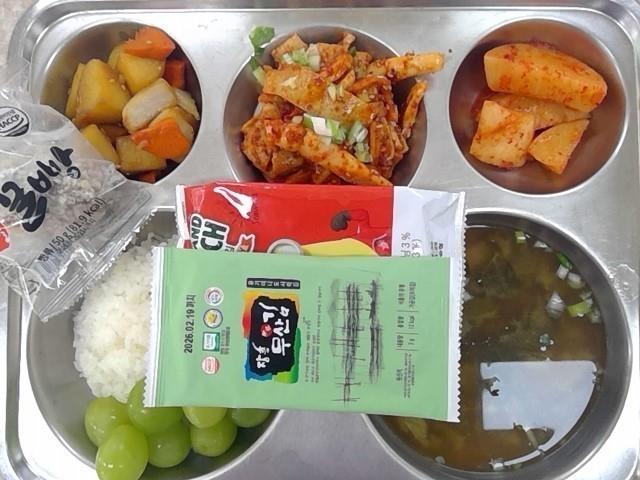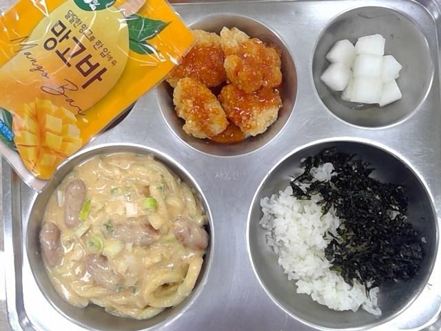 저녁:(자)쌀밥+김자반,투움바누들떡볶이,크런치순살치킨,치킨무,아이스망고스틱