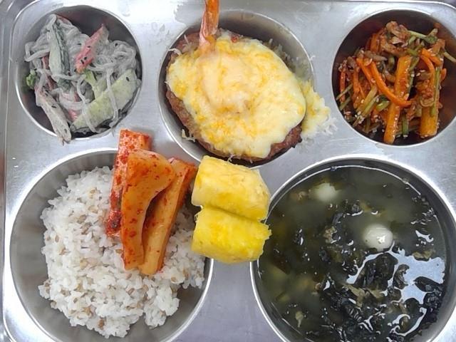 점심:가바현미밥,쇠고기새알미역국,실곤약샐러드,골뱅이초무침,눈꽃치즈매콤떡갈새,알타리김치,골드파인애플