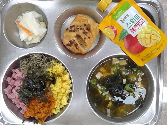 저녁:도시락비빔밥,두부장국,백김치,마시는 애플망고,메이플피칸파이