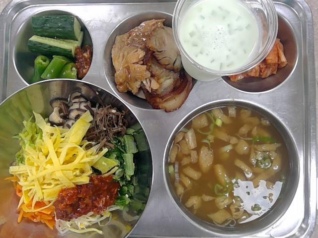 점심:비빔밥+계란지단,유부된장국,마늘보쌈+족발,배추김치,오이,풋고추(자),코코팜 멜론라떼