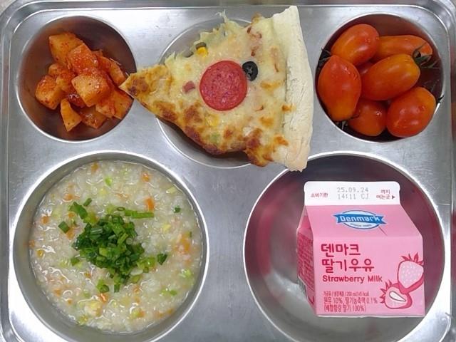 아침:새우야채죽,콤비네이션피자,깍두기,대추방울토마토,딸기우유