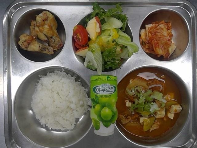 저녁:쌀밥,돈육짜글이찌개,유자드레싱샐러드,닭봉오븐구이,배추김치,얼려먹는 요구르트(청포도)