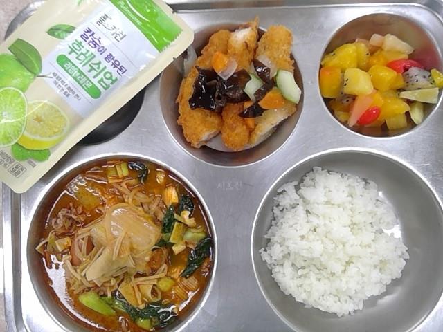 저녁:쌀밥(자),마라탕,오징어꿔바로우,라임주스,열대과일(망고,용과,파파야)모듬