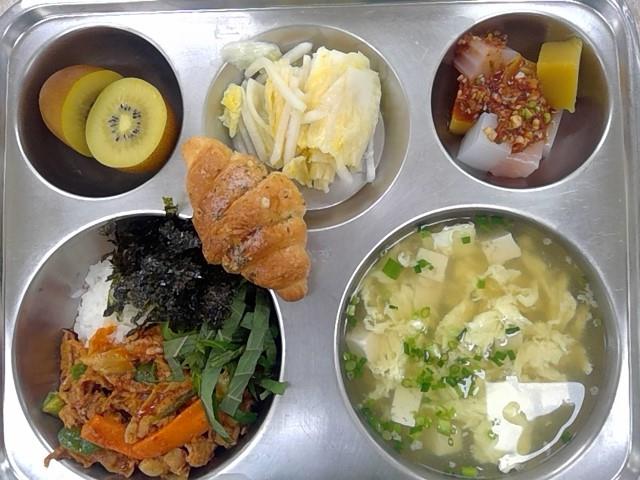 점심:삼겹살김치덮밥,계란실파국,삼색청포묵+양념장,백김치,갈릭크로와상,골드키위