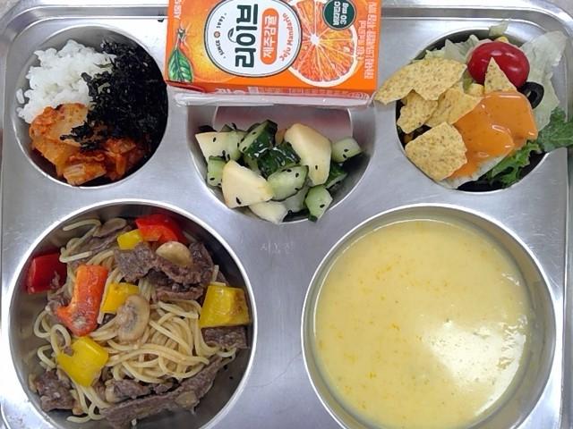 점심:(자)쌀밥+김자반+볶음김치,단호박크림스프,나쵸샐러드,사과오이초무침,한우스테이크파스타,오렌지주스
