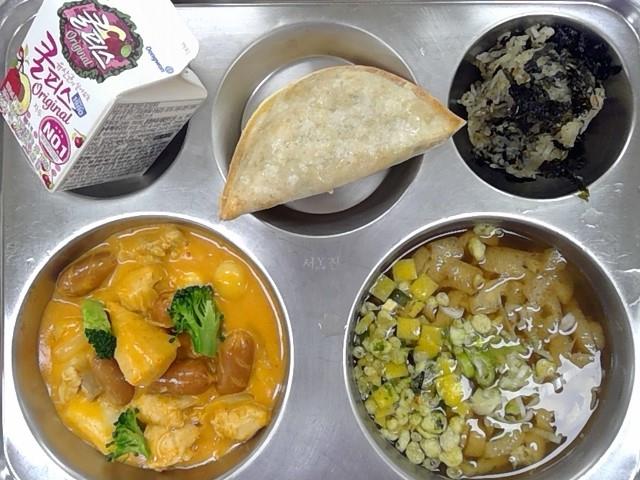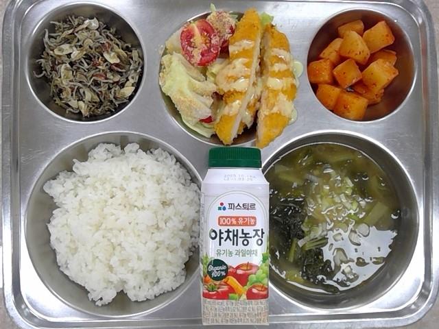 아침:쌀밥,들깨배추국,케이준치킨샐러드,멸치아몬드볶음,깍두기,과일야채주스(유기농)