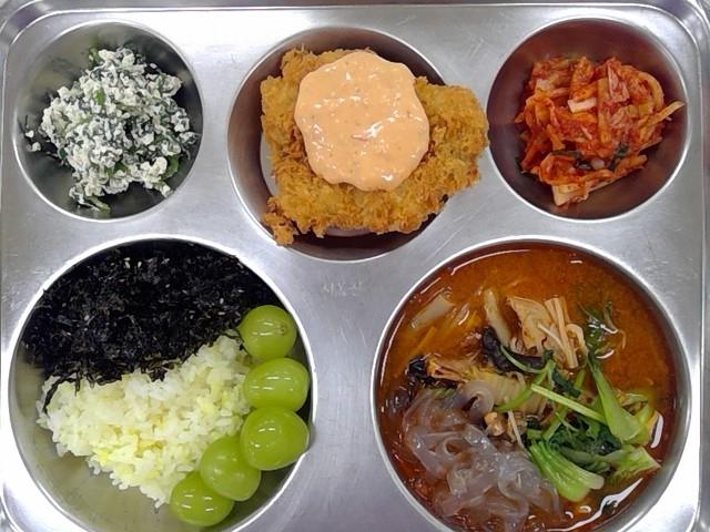 점심:강황쌀밥,얼큰샤브샤브,쑥갓두부무침,돌김자반,가자미튀김&치폴레소스,배추김치,샤인머스켓