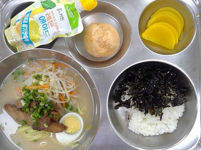 저녁:(자)쌀밥+김자반,돈코츠라멘,단무지,레몬에이드(완),초코아이스슈