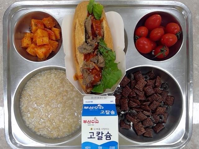 아침:누룽지죽,반미샌드위치,깍두기,강화우유,대추방울토마토,초코시리얼
