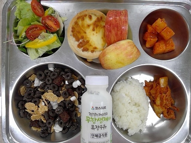 * 조식: 모듬시리얼, 유기농우유, 흰밥+볶음김치, 바네고르곤졸라피자, 새싹양상추샐러드 각두기, 사과