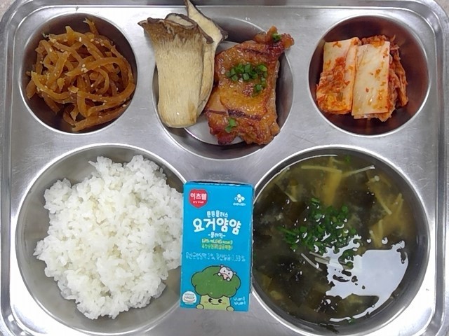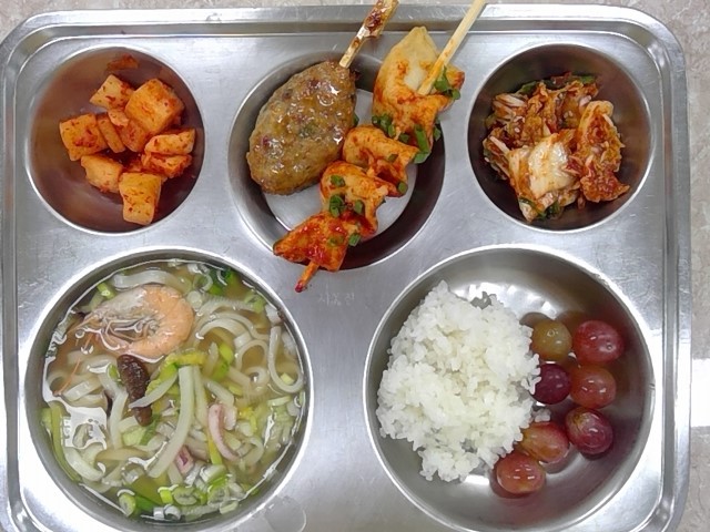 * 중식: 흰밥, 해물칼국수, 츠쿠네. 매콤꼬지어묵, 알배추겉절이, 깍두기, 씨 없는 포도