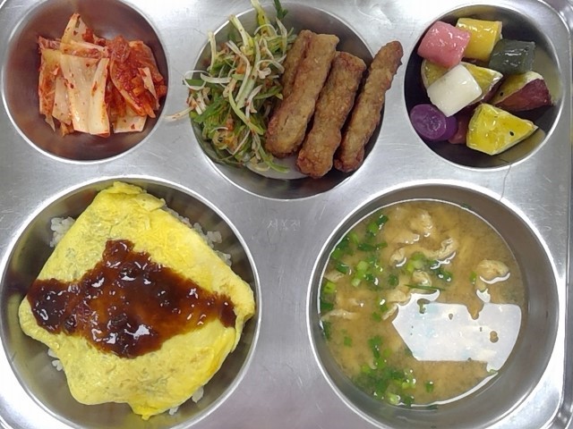 * 석식: 오므라이스, 유부된장국, 스틱떡갈비/파채무침, 배추김치, 고구마오색떡맛탕