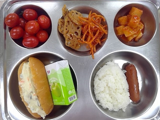 * 조식: 감자사라다빵, 흰밥+일미무침, 후랑크소시지, 깍두기, 방울토마토, 애플맛과즙워터
