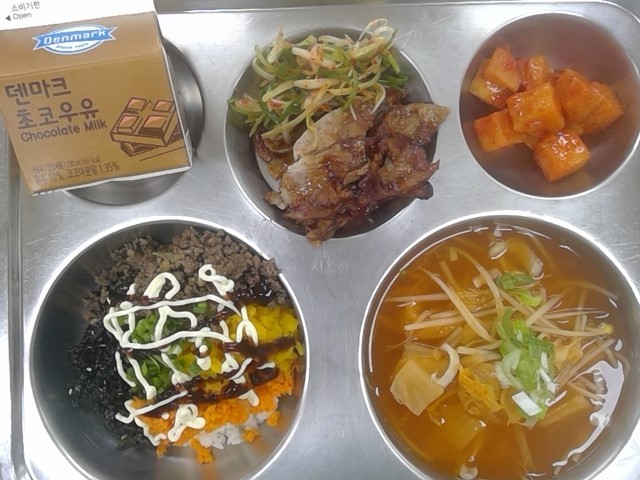 * 석식: 소보루비빔밥, 콩나물김치국, 동파육, 파채무침, 깍두기, 초코우유
