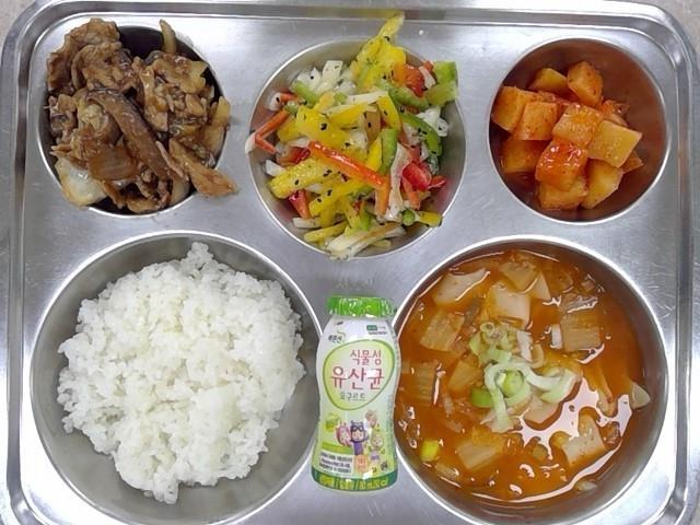 아침:흰밥,김치수제비국,파프리카무침,돼지고기간장볶음,깍두기,식물성유산균요구르트