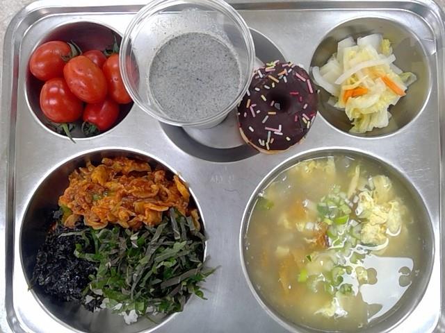점심:삼겹살김치덮밥,황태계란국,백김치,대추방울토마토,미니도넛(초코링),흑임자 라떼