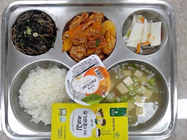 저녁:쌀밥,들기름 메밀국수(소량),두부새우젓국,닭볶음(닭볶음),백김치,요거트푸딩,유기농맛김