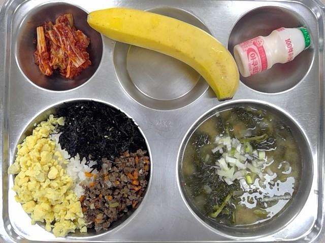 아침:민찌한우볶음,쌀밥,무청시래기국,스크램블에그,배추김치,바나나,65ml요구르트