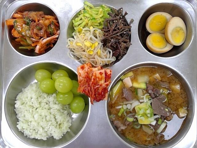 점심:녹차카테킨밥,차돌박이된장찌개,달걀장조림,골뱅이초무침,삼색나물2,배추김치,샤인머스켓