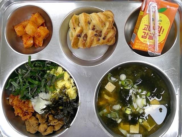 저녁:깐부치밥,두부장국,깍두기,감귤주스,메이플피칸파이