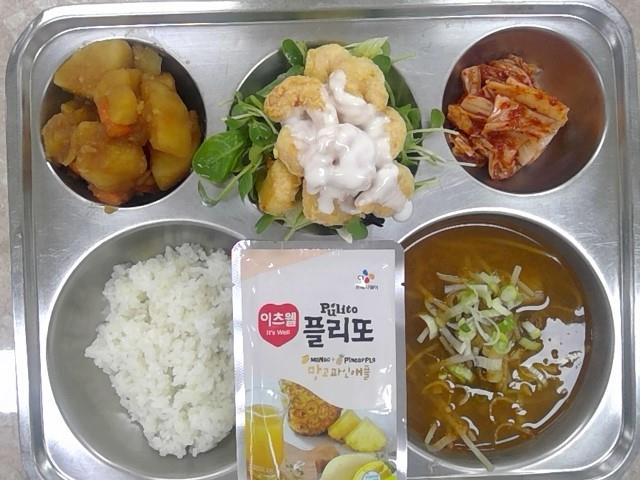 저녁:쌀밥,쇠고기국,감자조림,레몬크림새우/어린잎샐러드,배추김치,망고파인플리또