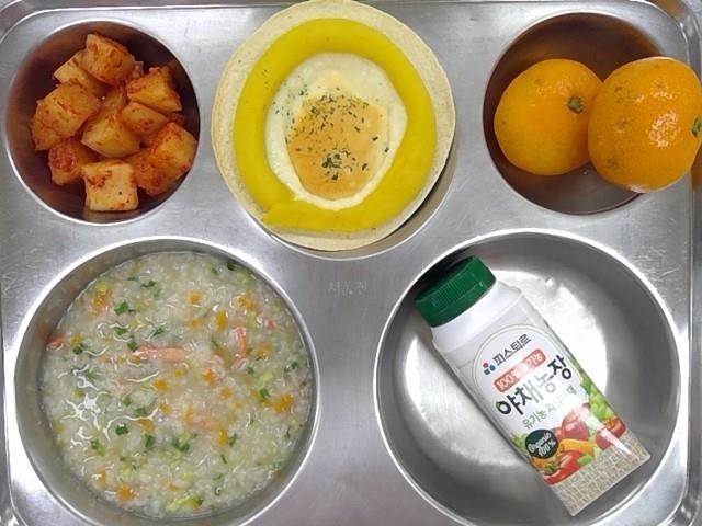 아침:대게살야채죽,수제고구마피자,깍두기,과일야채주스(유기농),귤