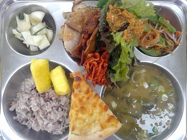 점심:혼합잡곡밥,비빔쫄면(보쌈),들깨배추국,마늘보쌈+족발,무말랭이무침,양파절임,고르곤졸라피자,골드파인애플,상추쌈