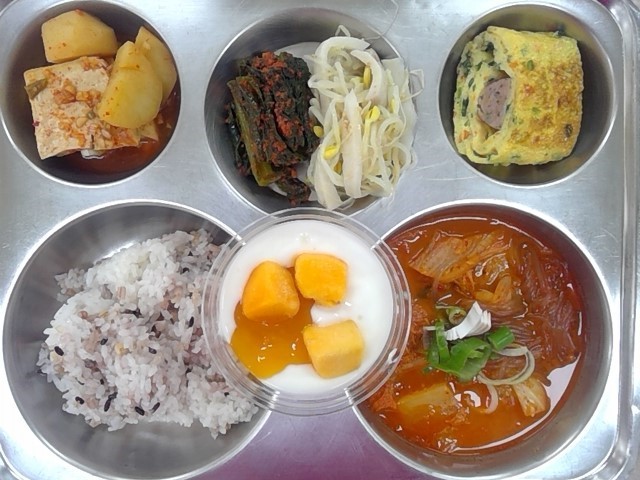 점심:혼합잡곡밥,돼지갈비김치찌개+당면사리,새송이콩나물무침,소시지품은달걀말이,두부감자조림,갓김치,수제컵요거트(망고)