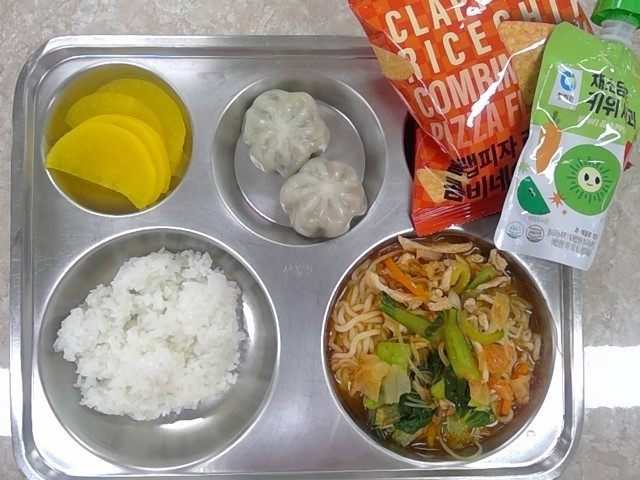 저녁:쌀밥(자),꼬꼬짬뽕,단무지,찰감자만두,키위사과주스,피자 라이스칩