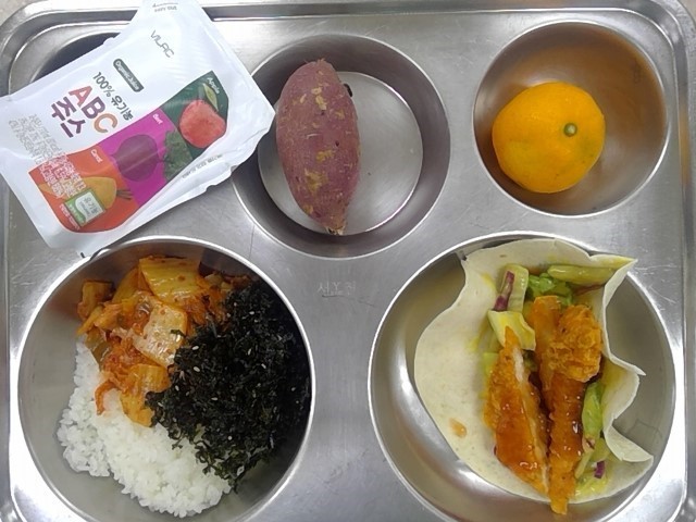 아침:(자)쌀밥+김자반+볶음김치,고구마오븐구이,귤,에이비씨주스,우리밀치킨또띠아