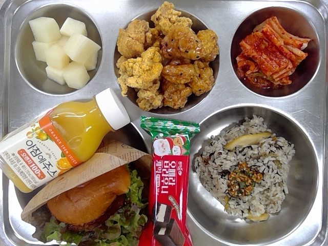 * 중식: 떡갈비버거, 톳밥/양념장, 반반치킨, 배추김치, 치킨무, 크리스마스케익, 오렌지주스