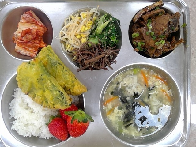 * 중식: 흰밥, 떡만두국, LA갈비구이, 깻잎전, 삼색나물, 배추김치, 딸기