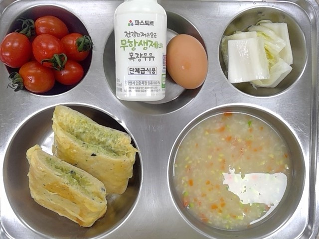 * 조식: 치아바타샌드위치, 게살죽, 삶은달걀, 백김치, 무항생제우유, 방울토마토
