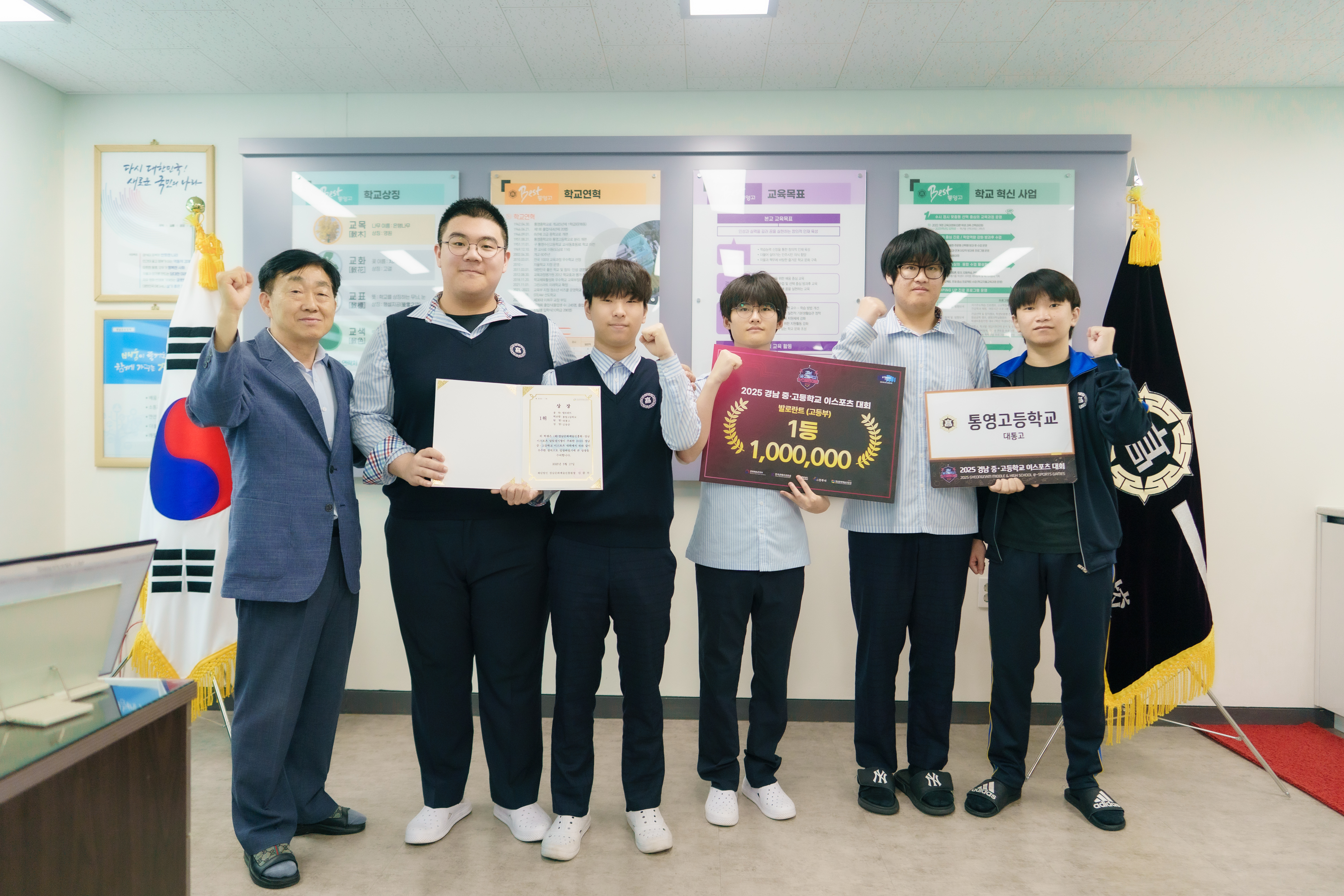 지난 5월 17일(토) 경남 이스포츠 상설경기장에서 개최된 '2025 경남 중·고등학교 이스포츠 대회' 발로란트 부문에 출전한 본교 2학년 '대통고' 팀이 영예의 우승을 차지했다. 대회에 참가한 '대통고' 팀(김동준, 김민결, 임동은, 조태언, 양채웅)은 예선전에서 쟁쟁한 팀들을 제치고 결승전에 올라 진주기계공고의 추격을 뿌리치고 우승을 차지했다.