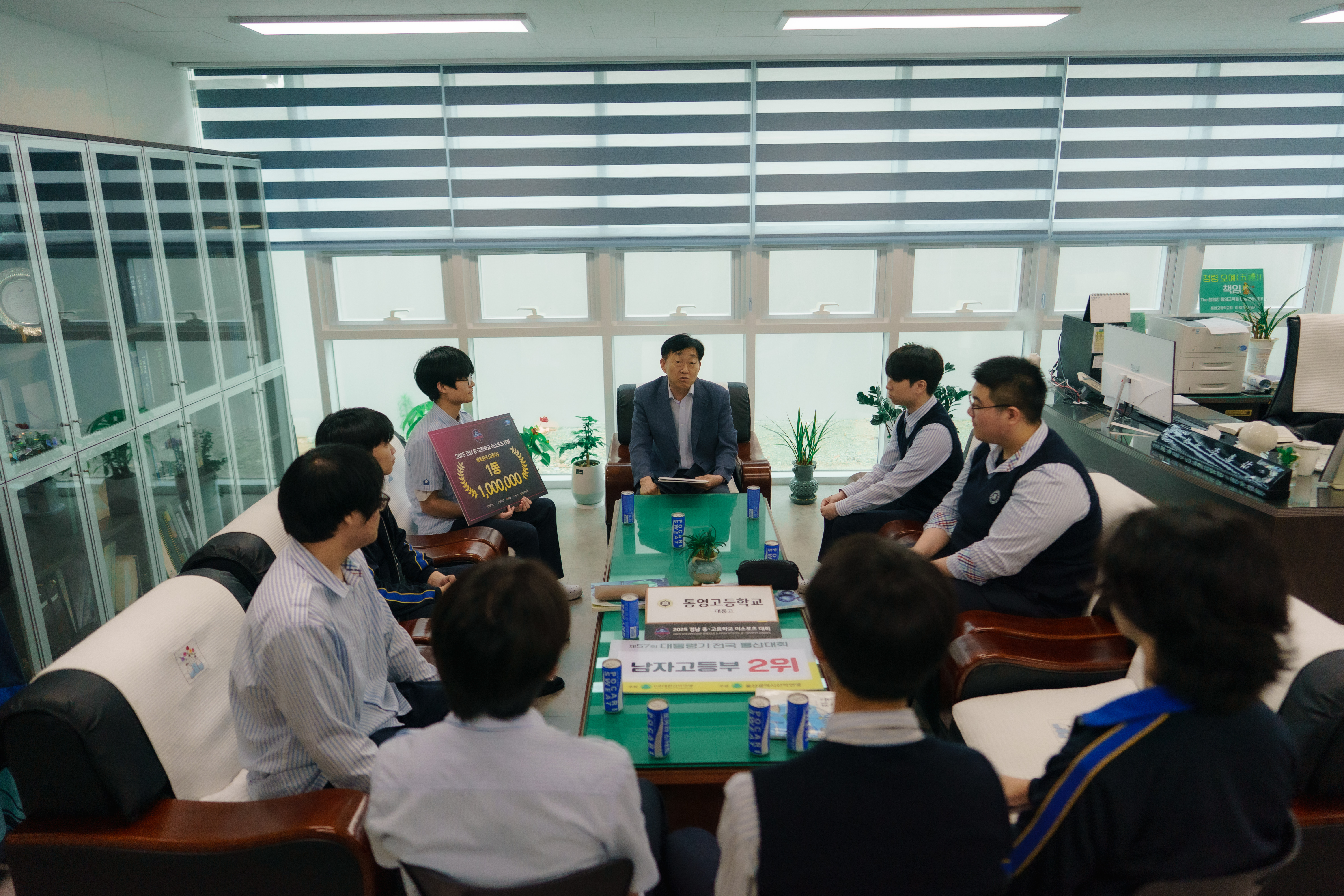 대회가 끝난 후 본교 교장선생님께서 교장실에서 학교의 명예를 드높인 대통고 팀원들에게 축하와 격려를 전했다.(2025. 5. 21. 수)